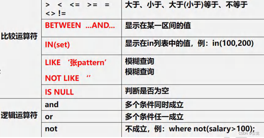 在 where 子句中经常使用的运算符