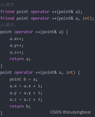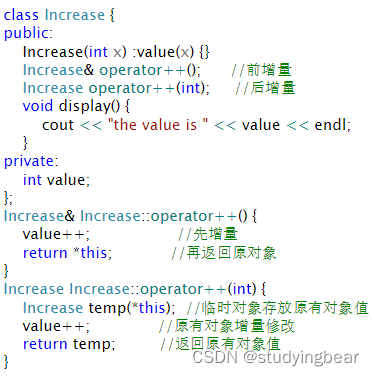 重载为类成员函数时 参数个数=原操作数个数-1 (后置++、--除外)