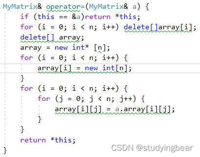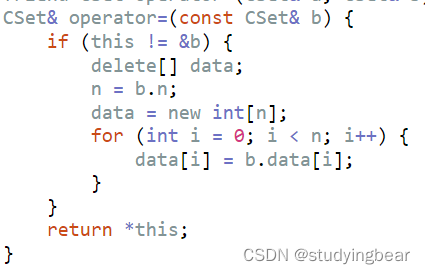 传入的参数需要声明为常量引用。释放实例自身已有的内存,如果在分配新内存前忘记释放自己已有的内存,则会出现内存泄漏。 判断传入参数与当前实例是不是同一个实例,如果是同一个,则立即返回