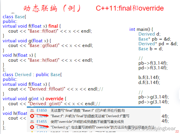 对成员函数使用关键字final必须声明为virtual虚函数,因为只有虚函数才支持在子类中重写,这时final关键字才会发挥禁止重写的功能。