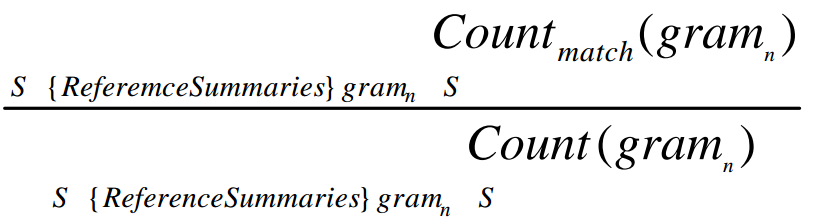 这个公式看起来有点小复杂,分母是多条参考摘要中,N-grams出现的总数,而分子是候选摘要中,匹配的N-grams的个数。