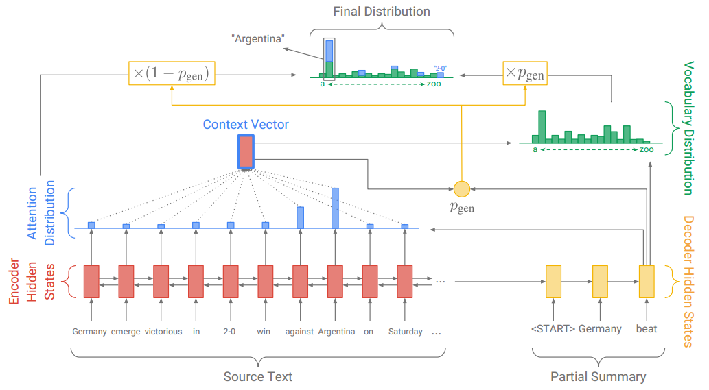 首先像Seq2Seq+Attention那样,计算注意力分布、上下文向量和基于原词表的单词概率分布。