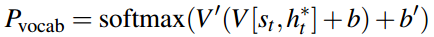 注意,公式左边的Pvocab(w)代表按原词表计算的单词概率分布,而右边的P(w)表示按加入OOV词后的新词表,计算的单词概率分布。