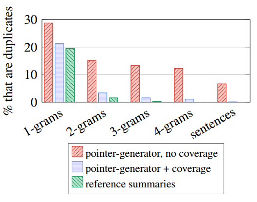 而加入Coverage机制后,重复的N-gram的数量和参考摘要中的数量差不多。