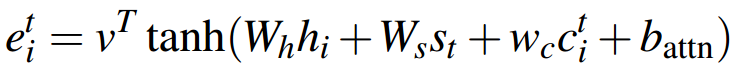 于是,把这个coverage向量加入到注意力分布的计算中: