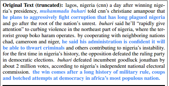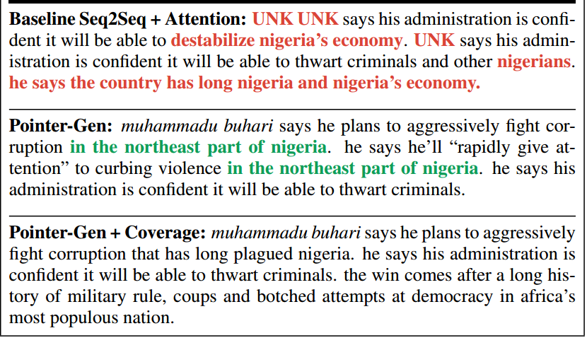 Pointer-Network:复现了原文中的词语和句子,把原文中的未登录词 muhammadu buhari 复制到摘要中,提升了准确率。但是 in the northeast part of nigeria 这段摘要重复出现了两次。