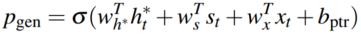 这个概率就像一个开关,用来决定是按原词表的单词概率分布,生成单词,还是按照原文单词的注意力分布,复制单词: