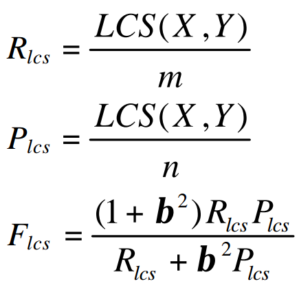 ROUGE-L需要计算Recall和Precision,然后得到类似于F1值的指标: