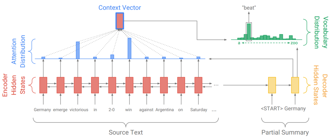 而如果预测的词是beat,这个单词在事先构建好的词表中,而不在原文中,那么beat没有注意力权重,只有按原词表计算的概率。