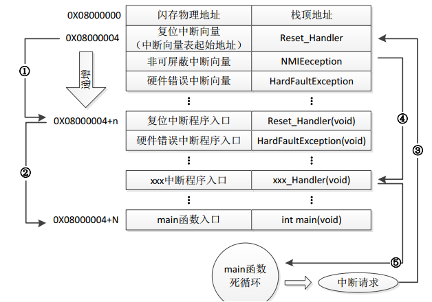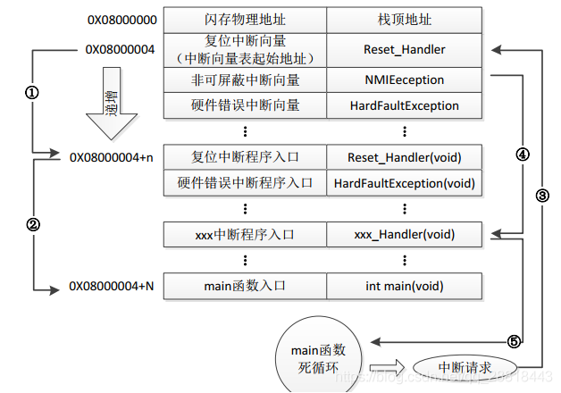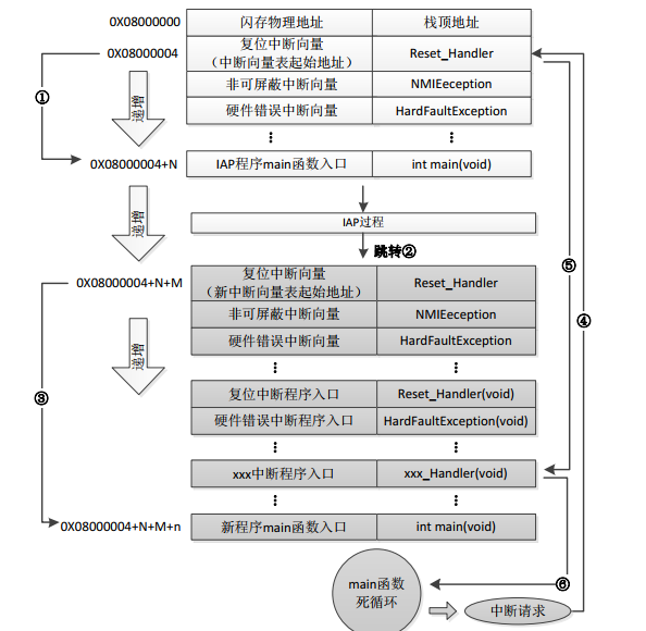 3.对于序号4,5的理解,当在应用程序中产生中断后,硬件依然将从0x00地址开始,但是由于设置了中断向量表的偏移,硬件根据中断向量表偏移和中断向量表的偏移,计算出APP程序对应的中断处理函数.所以有0x8000004+N(中断向量的偏 移)+M(中断向量表的偏移).