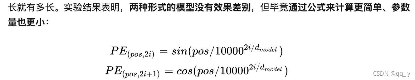注:必须要用正弦和余弦,因为这样通过三角函数的和角才能得到相对位置编码;但不是必须得是奇偶下标来分开使用sin和cos,只要分成两段就可以,因为后面的全连接层会重排坐标。