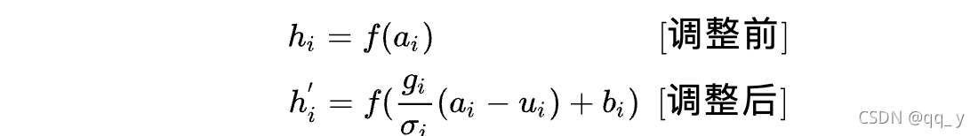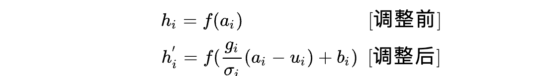 注:在梯度敏感区域,隐层的输出接近线性,模型表达能力会下降,因此引入gi和bi,对输出进行线性变换,稍稍改变输出的分布。(gi和bi是学习的参数)