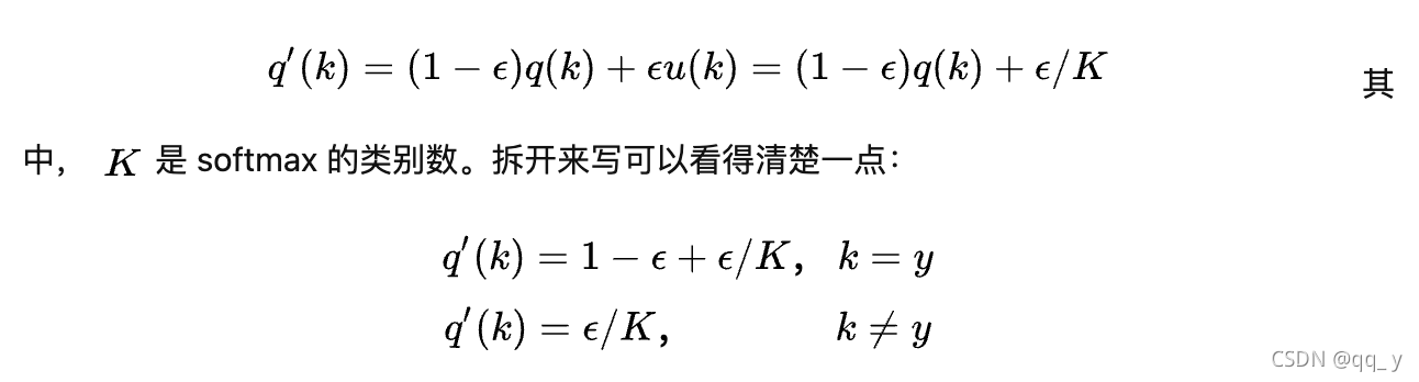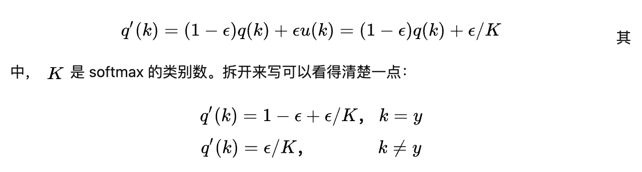 其中q(k)表示样本的类别为y(真实值)的概率,原文中均匀分布的参数为0.1。因此损失函数(交叉熵)变为