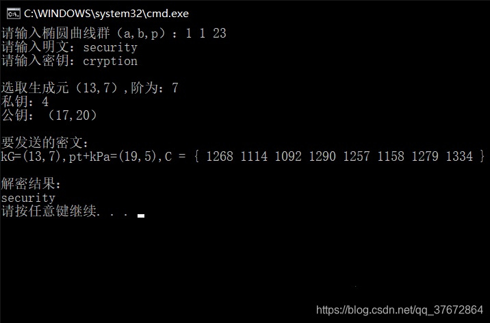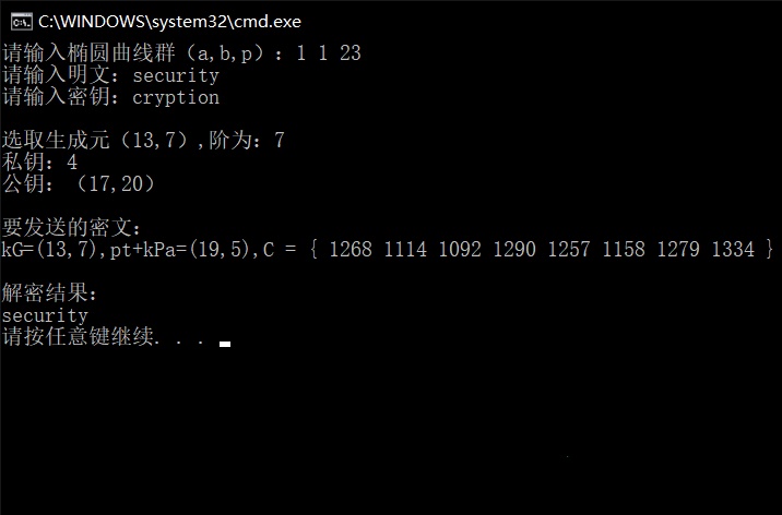 {srand(time(NULL));int a, b, p;point generator; int n;char SE[10];char CR[10];cout << "请输入椭圆曲线群(a,b,p):";cin >> a >> b >> p;cout << "请输入明文:";cin >> SE;cout << "请输入密钥:";cin >> CR;//计算所有点all_points(a, b, p);//选取生成元,直到阶为素数do{n = jie(generator, a, p);} while (judge(n) == false);cout << endl << "选取生成元(" << generator.x << "," << generator.y << "),阶为:" << n << endl;//选取私钥int ka = int(CR[0]) % (n - 1) + 1;//选取使用的密钥point pa = cal(generator, ka, a, p);//计算公钥cout << "私钥:" << ka << endl;cout << "公钥:(" << pa.x << "," << pa.y << ")" << endl;//加密int k = 0;//随机数kk = rand() % (n - 2) + 1;point C1 = cal(generator, k, a, p);//计算C1//m嵌入到椭圆曲线int t = rand() % num; //选择映射点point Pt = P[t];point P2 = cal(pa, k, a, p);point Pm = add(Pt, P2, a, p);cout << endl << "要发送的密文:" << endl;cout << "kG=(" << C1.x << "," << C1.y << "),pt+kPa=(" << Pm.x << "," << Pm.y << ")";int C[100];cout<<",C = { ";for (int i = 0; i