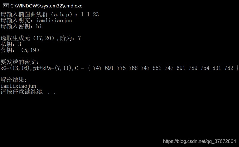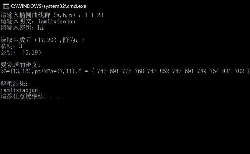 我结合着自己的理解,对算法流程和题目要求做了一些修改,以便更好地实现。由于题目给定的p为23,小了一些,我就不能按照指导书上的流程来完整实现,这不仅是,x取值范围固定为0~22的范围而导致数据无法恢复的问题,还有其可表示的信息太少了,以至于不能表示出26个英文字母的ASCII码值。为了解决这个问题,我结合着网上的一些资料,对把信息m嵌入椭圆曲线的过程做了少许修改,具体实现可以参考上文代码,大概流程就是任意取一个椭圆曲线上的点,C[i] = int(SE[i]) * Pt.x + Pt.y,这样等于隐藏的是我们选择的这一点。解密时通过m = (C[i] - temp1.y) / temp1.x,反向计算即可恢复,这也算是一种信息的嵌入方式。此外,由于给的密文和密钥是英文字符,如果转换成ASCII码我担心计算过程的溢出问题,所以我是拆成一个一个字母处理的,不过这并不影响整个ECC的实现原理和方法。