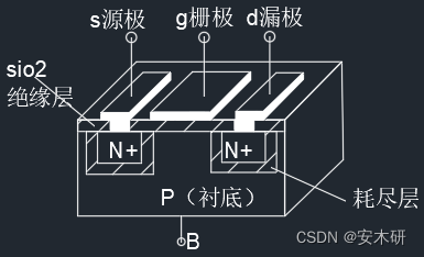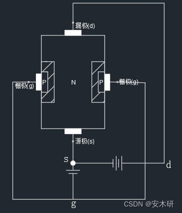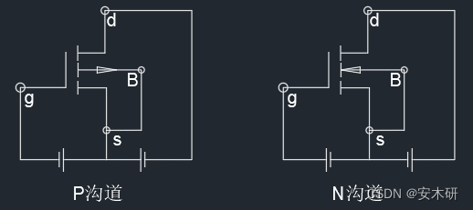 通常将衬底(B)与源极(s)连接到一起,这样栅极和衬底就组成了一个电容器,通过改变栅源之间的电压控制漏极电压。
