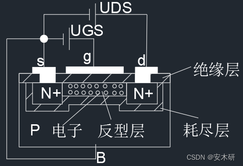 当g--s之间加正向电压,由于存在二氧化硅,导致栅极聚集大量正电荷,但无电流;由于同种电荷相斥,异种电荷相吸,耗尽层加宽,且大量的负电荷向着栅极聚集,形成了由电子构成的沟道(反型层)。