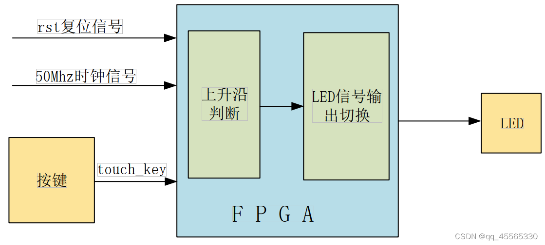 本节的实验任务是使用触摸按键控制LED灯的亮灭,开发板上电后LED为点亮状态,手指触摸后LED熄灭;当再次触摸时,LED点亮。通过捕获触摸按键端口的上升沿,得到一个时钟周期的脉冲信号,来控制LED灯的亮灭。