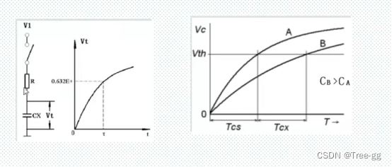 同样的条件下,电容值C跟时间值t成正比关系,电容越大,充电到达某个临界值得时间越长。