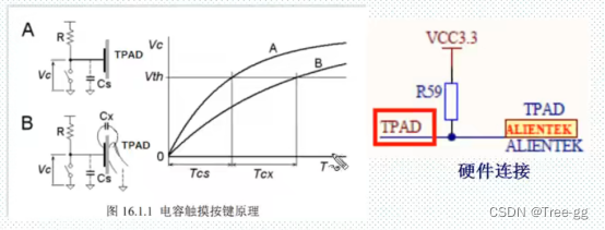 TPAD连接的是芯片的引脚, 设置成推挽输出0的时候芯片内部是接地的所以电流是直接通过引脚接地电容就没有电流充电相当于电容在放电,放电完成后,把引脚配成浮空输入,并开启输入捕获,同时开启定时器计数,引脚没接地了,电流会给电容充电,假设我们没有按下的时候是500ms会高电平,当按下后相当于并连了一个电容会充电时间更久假设是1000ms才会有一个高电平,不断计算判断捕获时间就可以判断是否按键按下。