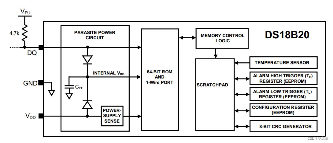 - 左侧方框为“寄生供电”电路:当VDD无法供电时,DQ会承担起供电的任务,但为保证内部电路正常工作需要DQ强上拉,本次实验不涉及。