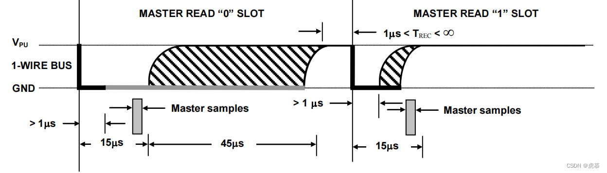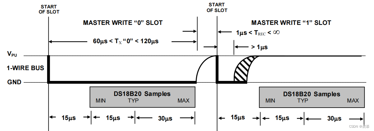 - 发送一位:主机将总线拉低60~120us,然后释放总线,表示发送0;主机将总线拉低1~15us,然后释放总线,表示发送1。从机将在总线拉低30us后(典型值)读取电平,整个时间片应大于60us。