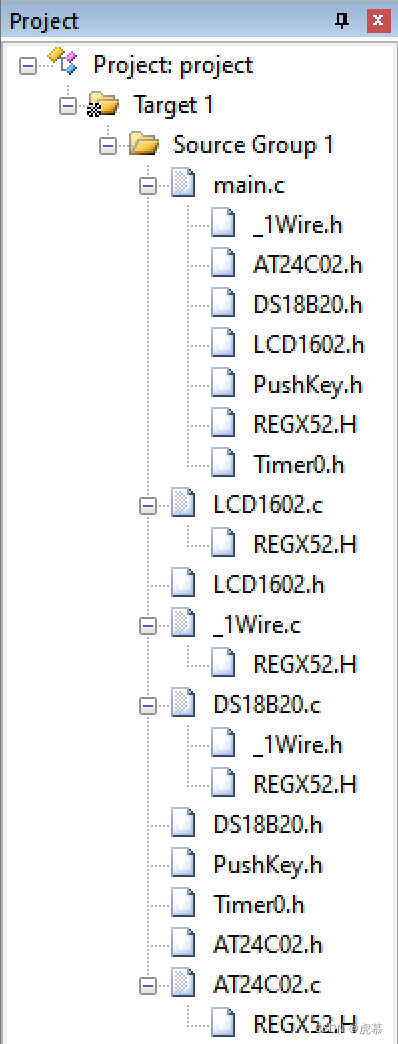 DS18B20.h、_1Wire.h、_1Wire.c、LCD1602.h、LCD1602.c与上一节实验相同;AT24C02.h、AT24C02.c、PushKey.h、Timer0.h、与12-2实验“秒表(定时器扫描按键和数码管)”相同。