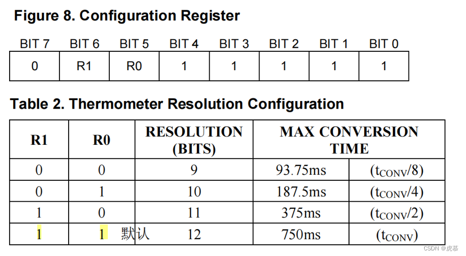 - Byte 4:配置寄存器,用于控制温度的分辨率。当然,分辨率越高,温度转换时间越长。
