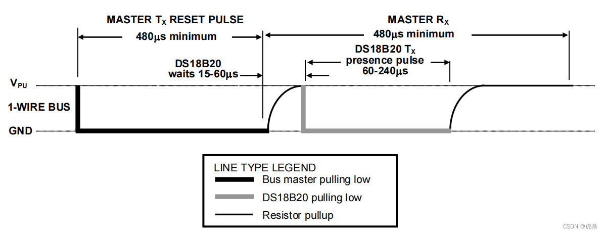 - 初始化:主机将总线拉低至少480us,然后释放总线,等待15~60us后,存在的从机会拉低总线60~240us以响应主机,之后从机将释放总线。