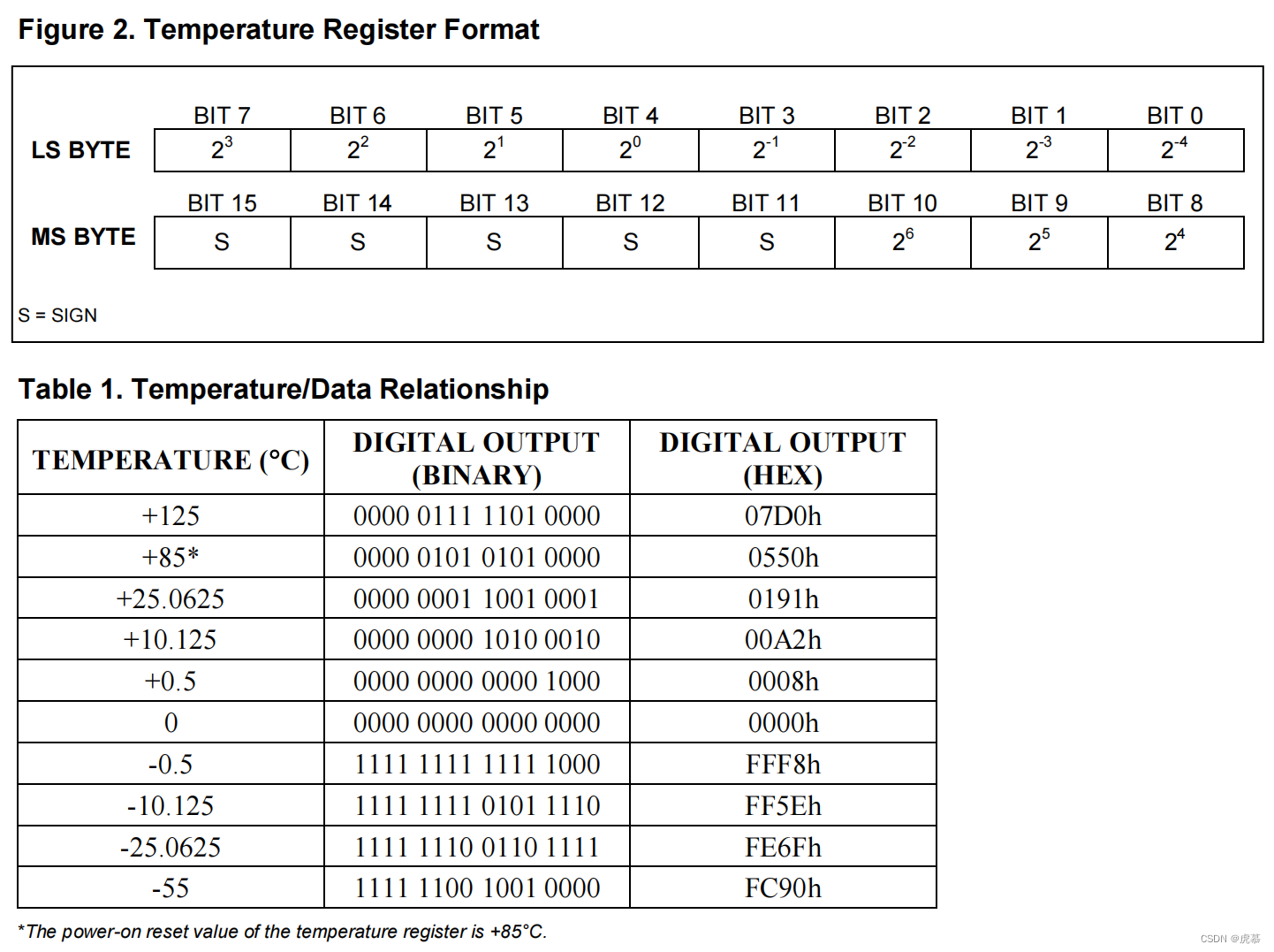 - Byte 0&1:存储温度信息。高5位全是符号位,1负0正;其他11位组成数字,注意低4位是小数部分。