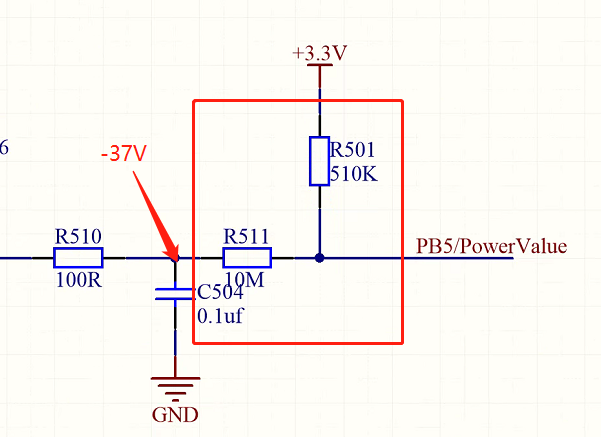 将10M,510K换成了100K,5.1k,此时adc输出的电压正常。