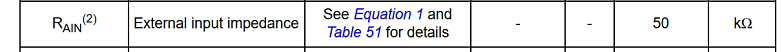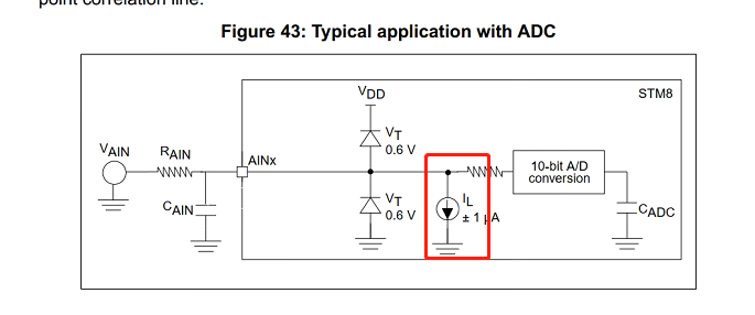 查找手册关于这块的说明,发现没有类似于输入阻抗的要求,只有输入电流的限制,猜测有可能是输入电流过小导致的问题。查到网上的一些说法,芯片adc的输入阻抗大概在10k左右,大于这个值就有可能产生问题。查stm8 的datasheet没有找到关于RAIN的说明,查到了stm32中的相关说明,其adc的输入阻抗为50K,所以推测stm8的输入阻抗也应为50K左右。