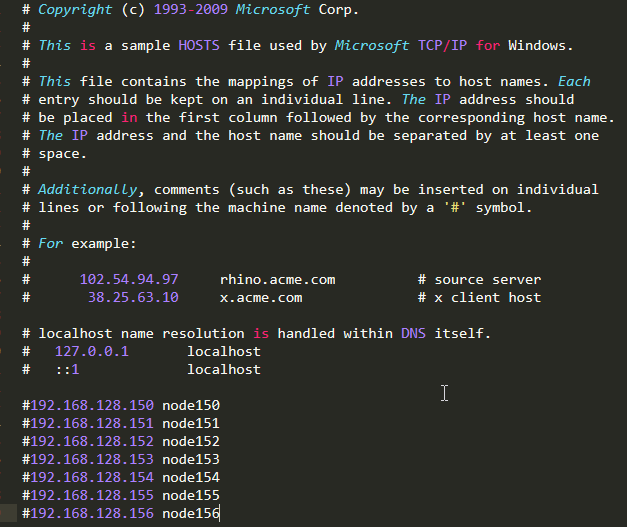 集群好久没用了,把里面的#号去掉,IP地址和机器名 eg:192.168.128.150 node150