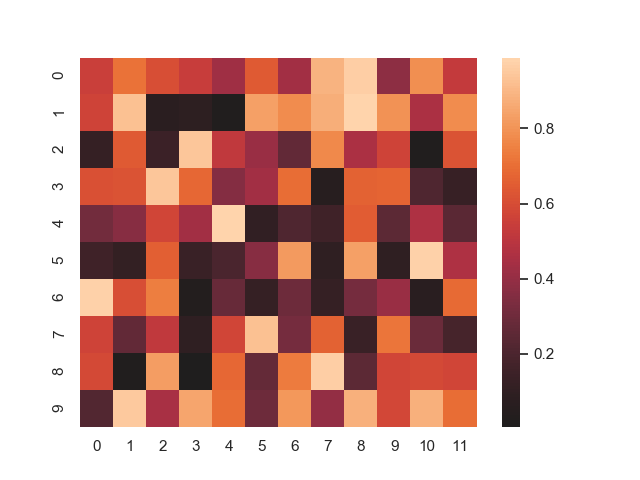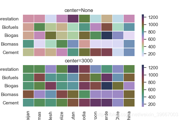 center:数据表取值有差异时,设置热力图的色彩中心对齐值;通过设置center值,可以调整生成的图像颜色的整体深浅;设置center数据时,如果有数据溢出,则手动设置的vmax、vmin会自动改变 。