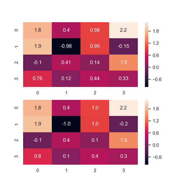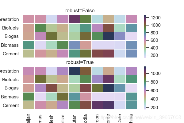 robust:默认取值False;如果是False,且没设定vmin和vmax的值,热力图的颜色映射范围根据具有鲁棒性的分位数设定,而不是用极值设定。