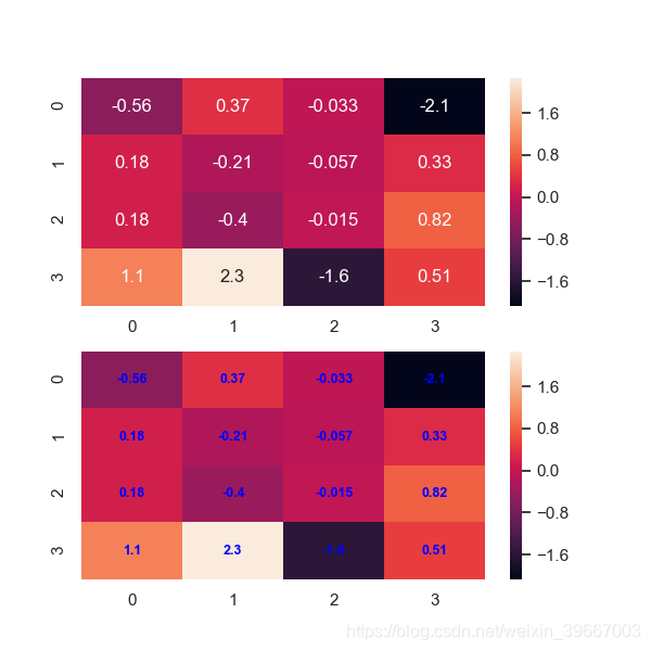 sns.heatmap(x, annot=True, ax=ax2, annot_kws={'size': 9, 'weight': 'bold', 'color': 'blue'})#fmt(字符串格式代码,矩阵上标识数字的数据格式,比如保留小数点后几位数字)