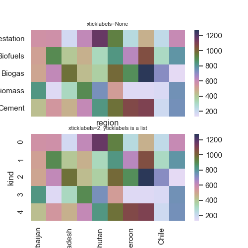 ax2.set_title('xticklabels=2, yticklabels is a list', fontsize=8)