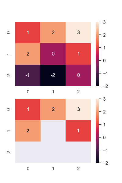 sns.heatmap(x, mask=x < 1, ax=ax2, annot=True, annot_kws={"weight": "bold"}) #把小于1的区域覆盖掉