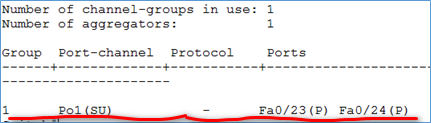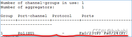 1、show etherc summary:一定要看到如图最后一行的po1,表示已经由 f0/23、f0/24两端口聚合成一条链路 port-channel