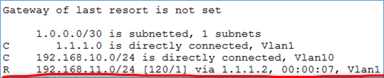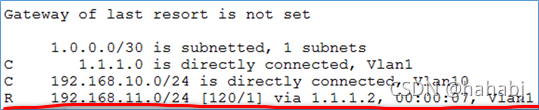 2、 show ip route的结果:一定要看到最后一条 R 192.168.11.0/24……类似的RIP路由,否则链路是不会连通的。