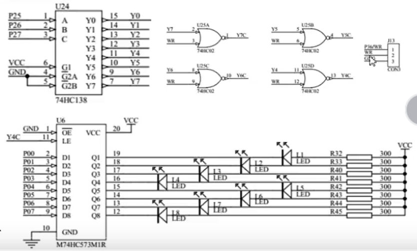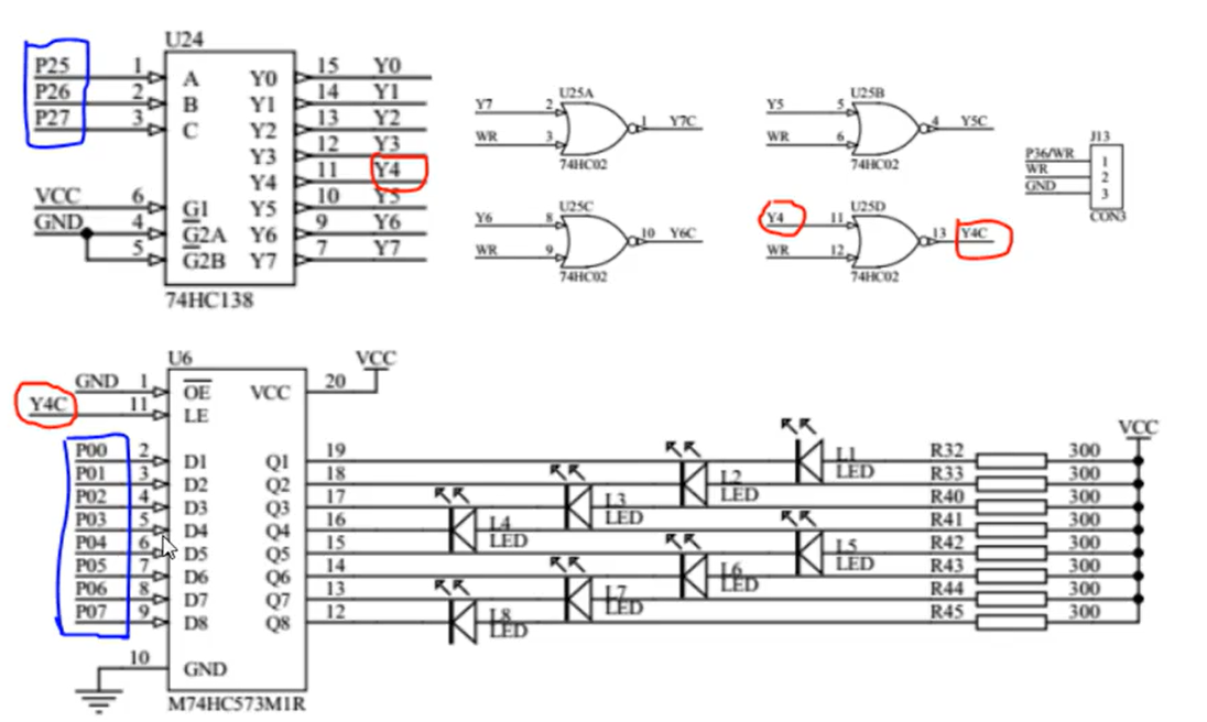 由原理图可知要使LED灯亮Q端需要输出低电平,也就是说D端要同步输出低电平。所以Y4C需要是高电平,上面我们说到WR脚接J13的3脚选择IO扩展模式,也就是低电平。同时,需要Y4(74HC02)给一个低电平才会在经过一个或非门之后使Y4C输出一个高电平,而Y4又由三八译码器的Y4控制.所以我们要调节P25-27来完成上述任务。