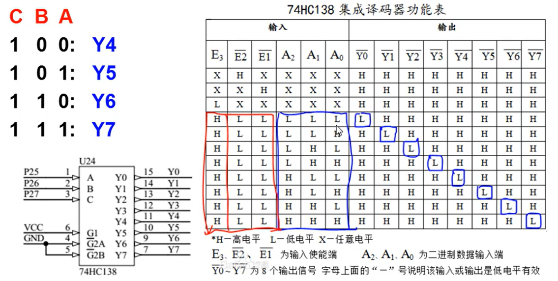 1️⃣74HC138:俗称三八译码器(非常简单)有六路输入八路输出,其中P25、P26、P27控制Y0-Y7由哪个输出。