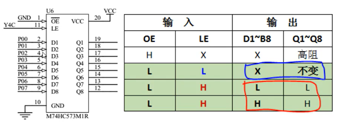 4️⃣74HC573:(非反转锁存器)1脚为片选,当1脚接低电平时选中左边的一排引脚,11脚为使能脚,接高电平时锁存器对于数据是透明的(同步输出,也就是D1-D8对应Q1-Q8,D输入什么Q输出什么)。当锁存器接低电平时数据会锁存,也就是不会同步了。