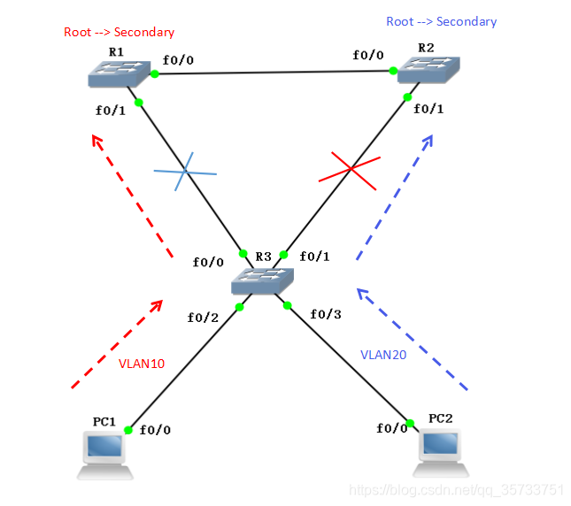 也就是说,PVST技术会为VLAN10和VLAN20设置不同的主备转发链路(红色表示VLAN10,蓝色表示VLAN20),以VLAN10为例,VLAN10的数据流量默认情况下是转发到主链路的,但是当VLAN10的主链路发生故障时,就会切换到VLAN10的备用链路上转发数据,此时VLAN10和VLAN20的数据流量都是转发到同一链路的。