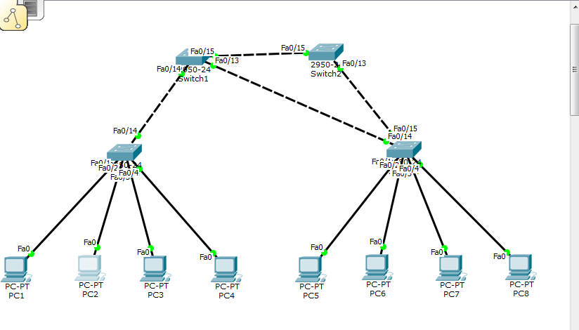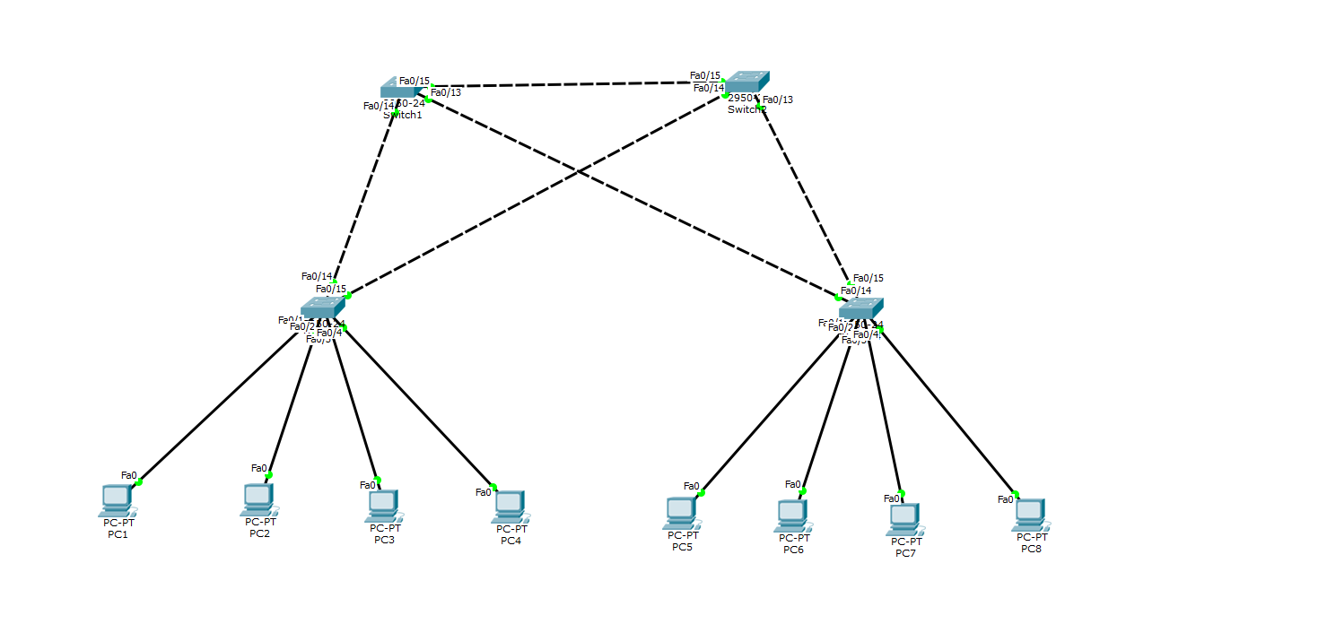 为了验证负载均衡,验证时需要将交换机上的虚线去掉一根或者两根(但两个交换机之间必须有线),然后用PC机ping