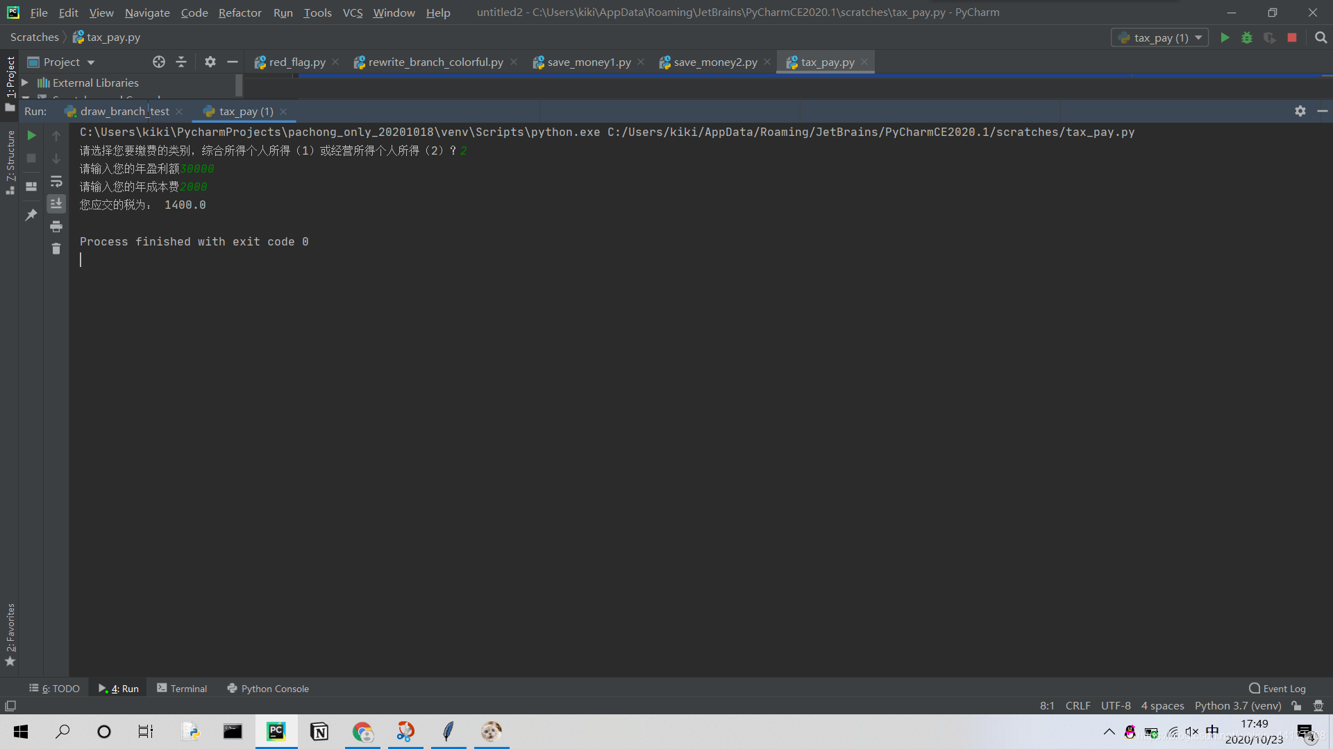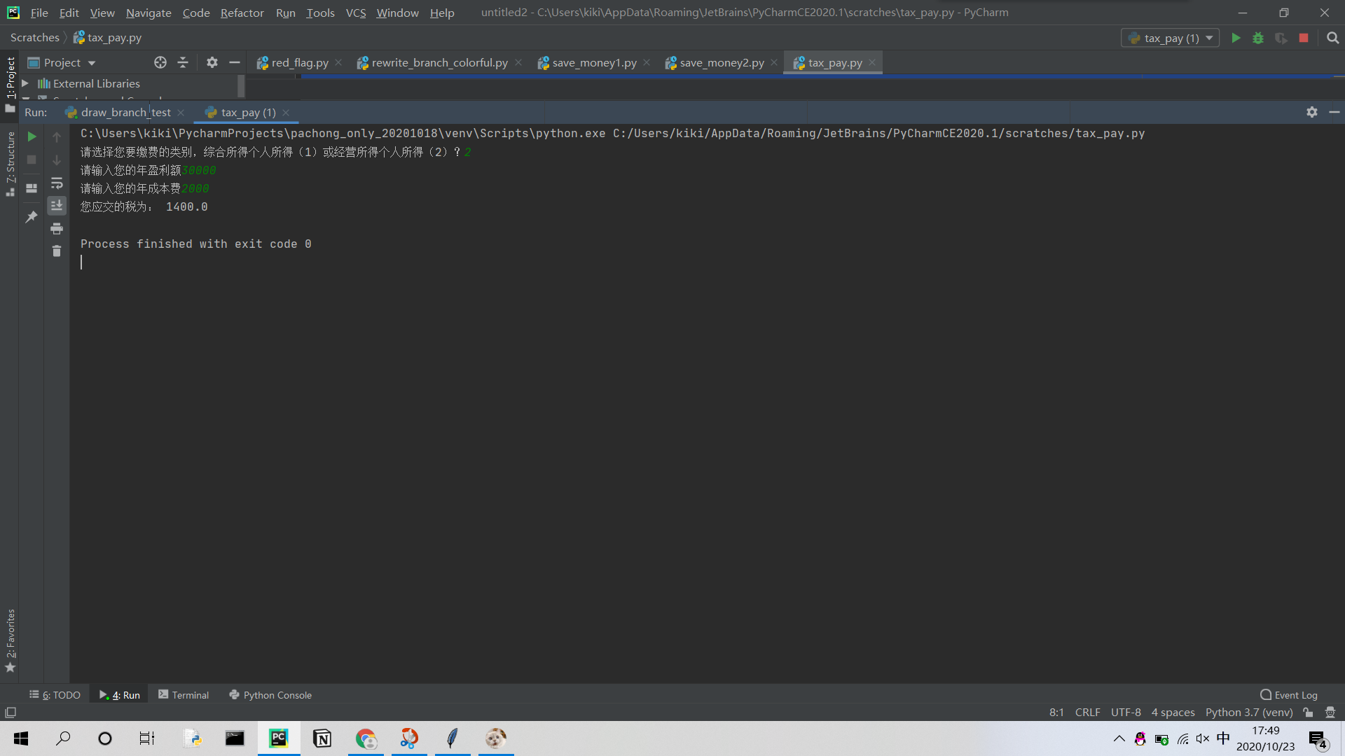 def tax_busi_pay(busi_wage,tax_year,busi_cost):if busi_wage<=30000:tax_year=busi_wage*0.05print('您应交的税为:',tax_year)elif busi_wage<=90000 and busi_wage>30000:tax_year=busi_wage*0.1-1500print('您应交的税为:', tax_year)elif busi_wage<=300000 and busi_wage>90000:tax_year=busi_wage*0.2-10500print('您应交的税为:', tax_year)elif busi_wage<=500000 and busi_wage>300000:tax_year=busi_wage*0.3-40500print('您应交的税为:', tax_year)elif busi_wage>500000:tax_year=busi_wage*0.35-65500print('您应交的税为:', tax_year)def main():tax_item=int(input('请选择您要缴费的类别,综合所得个人所得(1)或经营所得个人所得(2)?'))if tax_item==1:year_get = float(input('请输入您的年收入'))insurance_add=float(input('请输入可扣除的三险一金'))#应纳税所得额=年度收入-60000元(起征点)-专项扣除(三险一金等)-专项附加扣除-依法确定的其他扣除year_wage = year_get - insurance_add-60000tax_wage_pay(insurance_add,year_get,year_get)elif tax_item==2:busi_get=float(input('请输入您的年盈利额'))busi_cost=float(input('请输入您的年成本费'))# 应纳税额=(全年收入总额-成本以及损失)*适用税率-速算扣除数busi_wage = busi_get - busi_costtax_busi_pay(busi_wage,busi_cost,busi_get)if __name__=='__main__':main()