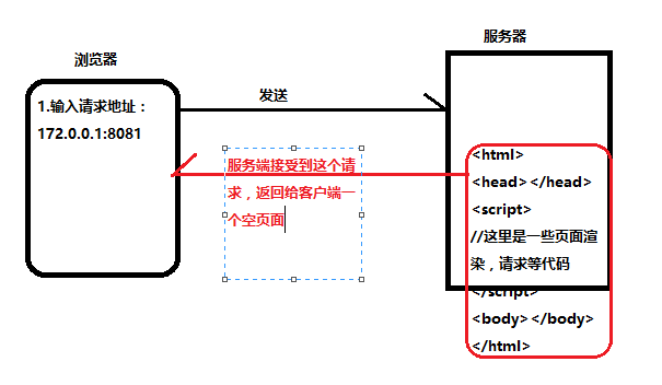 (2)客户端拿到服务端的空字符串页面,然后从上往下开始执行里面的代码,当执行到script中有请求或者渲染等代码时,就会对服务器再次发出请求