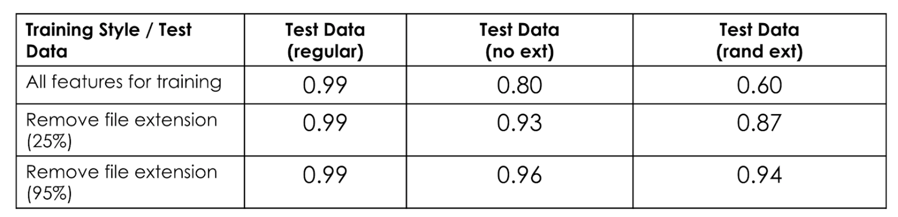 As mentioned earlier, during training time we removed a percentage of file extensions from our training data to encourage the model to learn from the vocabulary of the files. The table below shows the performance of our model with different fractions of file extensions removed during training time.