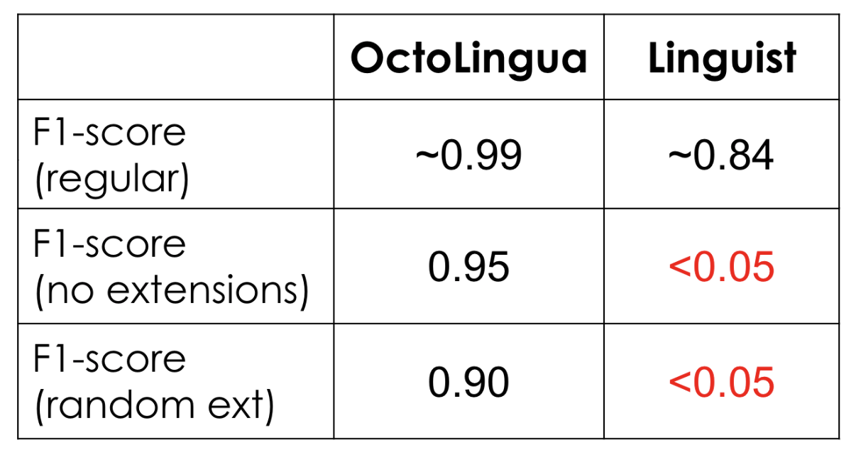 The table below shows how OctoLingua maintains a good performance under various conditions, suggesting that the model learns primarily from the vocabulary of the code, rather than from meta information (i.e. file extension), whereas Linguist fails as soon as the information on file extensions is altered.