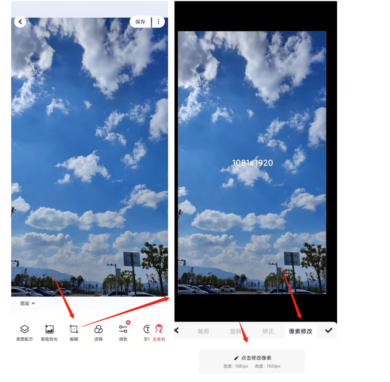 第3步:点击“编辑”按钮,并在该功能下找到“像素修改”选项。接着,您将进入图片尺寸修改操作界面。